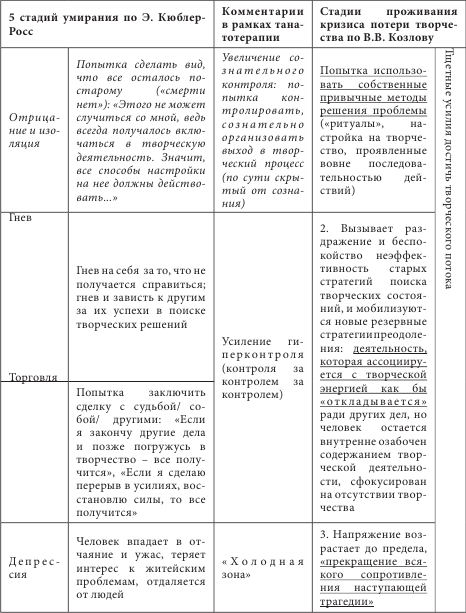 Выделенные Кюблер-Росс Э. [30] пять стадий, которые проходит человек, получив известие о своей неизбежной смерти, на наш взгляд, находят отражение и в стадиях проживания кризиса потери творчества, описанных В.В. Козловым [29]: