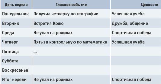 В тайм-менеджменте эта технология называется «Мемуарник». Пример мемуарника ребенка мы видим в табл. 1.