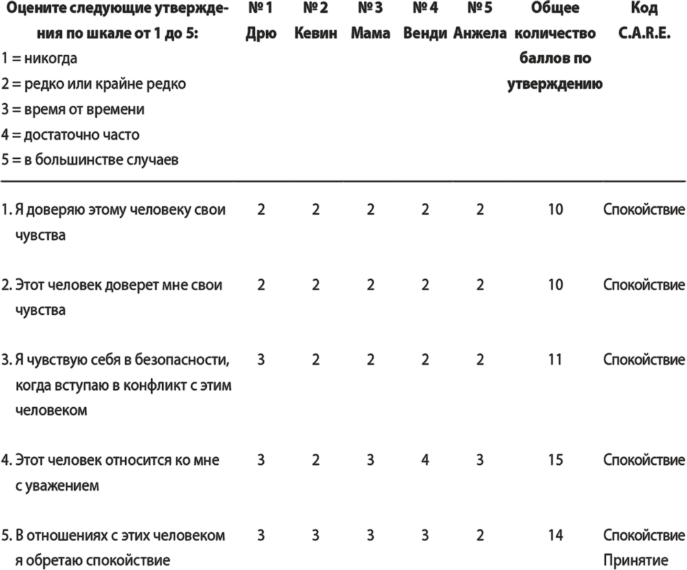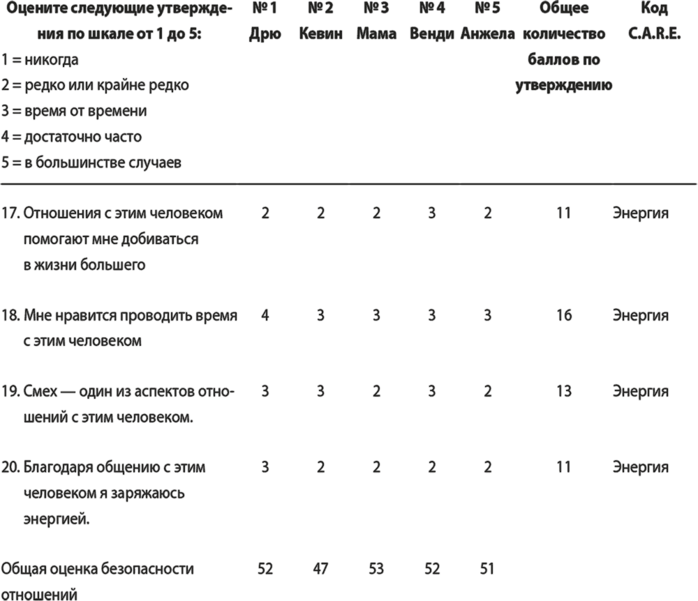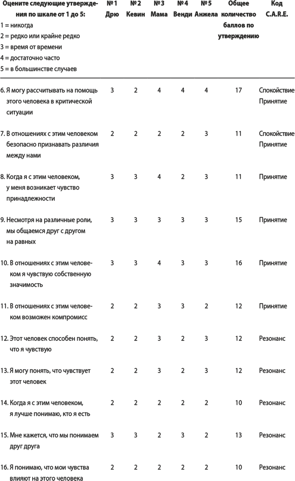 Я объяснила Руфусу, что, хотя нам действительно необходимо решить серьезную проблему с порнографией, пагубные привычки редко формируются без причины. Мы использовали таблицу оценки отношений по системе C.A.R.E., для того чтобы составить более полную картину его мира. Когда я попросила Руфуса назвать имена пяти человек, с которыми он проводит большую часть времени, он сразу же упомянул своих приятелей по карточным играм, Дрю и Кевина, а также маму и сестру Анжелу, которых очень любил и обычно общался с ними несколько раз в неделю. После этого он задумался. Мне пришлось напомнить ему о коллегах по работе, но, казалось, он не понимал, что с ними могут сложиться какие-то отношения. Они для для него были просто людьми, с которыми он работает. Но затем Руфус вспомнил о Венди, девушке из офисной кабинки напротив. Из огромного числа сотрудников Венди была единственной, кто оказывал на него влияние. Она часто улыбалась ему и всегда спрашивала, как продвигается его проект.
