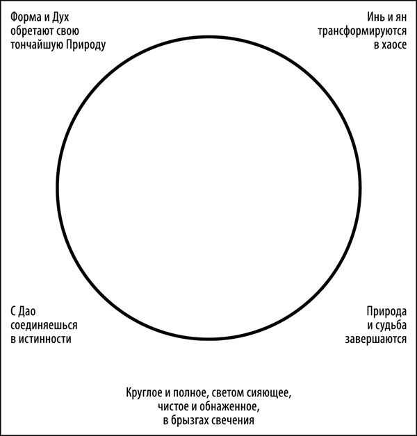 Теперь перемещение схемы Прежнего неба внутрь схемы Последующего неба позволяет понять состояние, когда истинное тело еще не разрушено. Тогда осуществляют Путь отсутствия причастности, чтобы посредством Пути достигнуть целостности формы, а для этого в противотоке осуществляют движение по потоку, в результате чего преображается посленебесный инь. Когда истинное тело становится ущербным, осуществляют Путь превращений и преображений наличия причастности, чтобы посредством искусства (техники) продлевать судьбу (жизнь), а для этого в потоке применяют противоток, в результате чего возвращаются к прежненебесному ян.