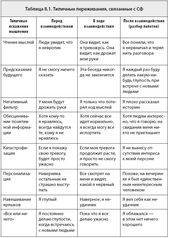 В табл. 8.1 приведены некоторые типичные для СФ искажения мышления. Они позволят вам разобраться, насколько сильно вы волнуетесь перед взаимодействием с другими людьми, как фокусируетесь только на себе во время него и как разбираете его на мельчайшие детали после.