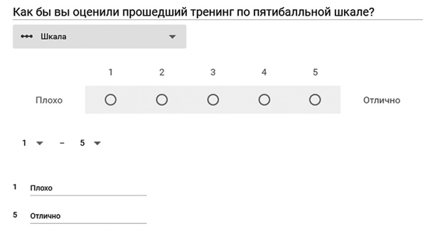 Шкала – вопрос, на который можно ответить, выбрав оценку из шкалы. Подойдет для вопроса «Как бы вы оценили прошедший тренинг по пятибалльной шкале?». Вы можете выбрать минимальный и максимальный баллы и сделать подписи к ним, чтобы респондент не путался в том, что значит минимальная и максимальная цифры: