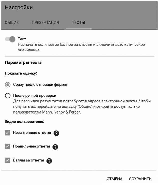 Если вы проводите тестирование, а не опрос – вам в третий раздел настроек. Активируйте тест и укажите, какие итоги тестирования будут доступны участнику (см. скриншот ниже).