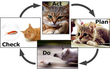 Модель вращающегося колеса, не имеющего ни начала, ни конца, впервые была предложена Эдвардом Демингом в середине прошлого века, и с успехом используется в настоящее время. Замечу, что, хотя цикл качества и изображается в виде окружности на плоскости, по сути, в нем отсутствует второе измерение. В этом легко убедиться, выбрав любую из фаз в качестве точки начала процесса и разомкнув окружность в линию. Пробегание одного такого цикла практически целиком лежит вдоль второй горизонтальной оси координат. Прежде чем пытаться обнаружить, как работают две оси и два измерения, по совету популярного актера, давайте сначала «потренируемся на кошках».