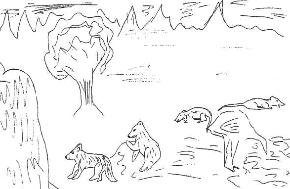 Аня рисует на прежнем рисунке другую крыску, направленную в противоположную сторону, и отвечает: «Тогда она будет жить своей жизнью, у нее появится что-то новое, например, своя норка, в которой будет красиво. Страус посмотрит на нее и подумает: маленькая мышка смогла, и я смогу. Он поднимет голову, станет есть цветы. А волк и медведица пошумят, а потом утихомирятся. Никто не будет обращать на них внимание. Мышка станет заниматься своими делами».