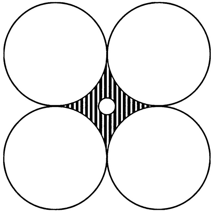Рис. 11.1. Энергетически обедненное представление (в центре). Представления изображены окружностями с разным радиусом. Чем больше их либидозная нагрузка, тем больше радиус. В результате центральное представление можно изобразить не как маленькую окружность, а как линию с отрицательной кривизной, как вогнутую окружность (заштрихованная область)