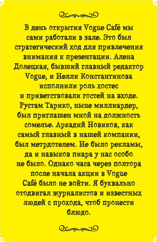 Через какое-то время Аркадий открыл ресторан «Гранд Опера», где играла живая музыка, танцевали красивые девушки. Я там многому научился, особенно русской кухне. Спасибо Дмитрию Каневскому, шеф-повару ресторана «Царская охота», который учил меня всем премудростям. Дмитрий – повар № 1 в России. Он потрясающий человек, которого я очень уважаю и благодарю за те знания, которые он мне дал. «Гранд Опера» был уникальным проектом. Там у меня стал формироваться русский вкус.