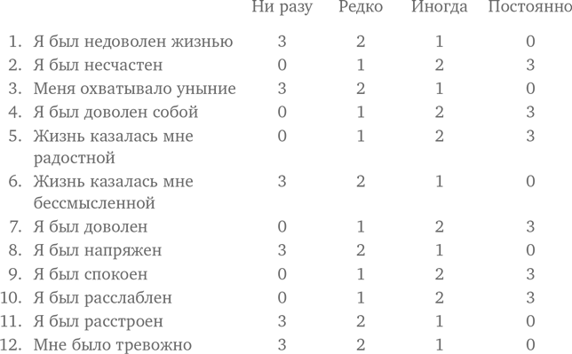 Специалисты по позитивной психологии пришли к выводу, что благополучие – это не только отсутствие психологических проблем, но и присутствие в жизни радости и удовлетворенности. До недавнего времени в большинстве психологических тестов не было вопросов, выявляющих эти положительные ощущения. Чтобы обнаруживать, есть ли в жизни человека благополучие в таком, более широком, смысле, мы с коллегой Джоном Малтби разработали приведенный ниже тест{134}.