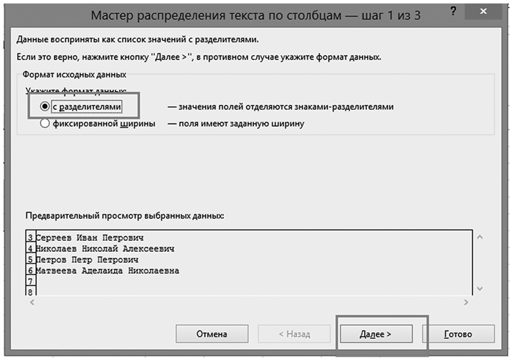 В появившемся окне выбираем «С разделителями» (если нужно разбить текст на блоки – например, номера кредитной карты по четыре цифры, – то выберите «фиксированной ширины») и нажимаем далее: