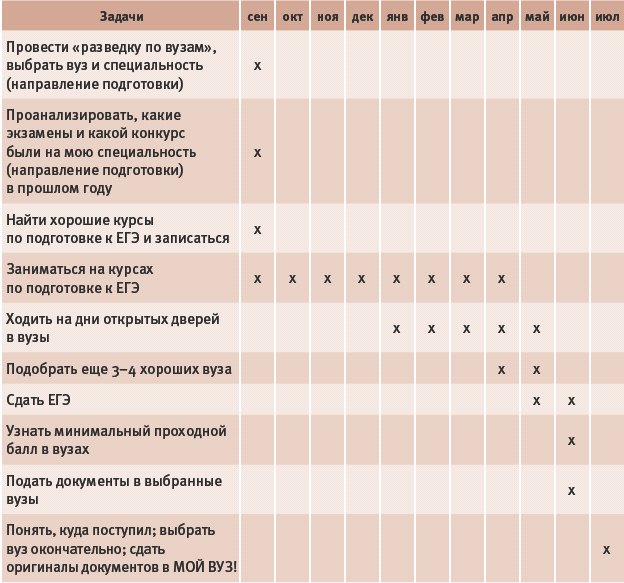 Составьте вместе с ребенком его план-график мероприятий на год. Помимо подготовки в вуз включите в него плановые события в школе. Если он продолжает заниматься в каких-то секциях и там тоже планируются те или иные мероприятия, включите и их. Если на этот период приходятся домашние события, в которых ребенок участвует, их тоже стоит включить для того, чтобы было максимально понятно, когда и чем ребенку предстоит заниматься. Это позволит увидеть и ошибки планирования (например, когда одновременно нужно будет сдавать ЕГЭ, писать итоговые контрольные работы в школе, принимать участие в выставке со своей собакой и покупать выпускное платье) и устранить их.