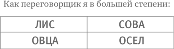 Признаюсь сразу, что мои варианты ответов подходят не всем читателям. Тесты на самооценку и моя «звериная» классификация проверялись в ходе наших семинаров на тысячах практикующих переговорщиков – и, судя по оживленным дискуссиям, которые они вызывали, читательская аудитория воспринимает мою классификацию неоднозначно.