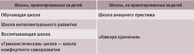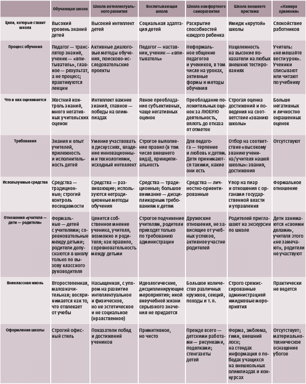 Вновь обратим внимание на то, что в таблице представлены крайние типы образовательной среды школы. Мы, например, работали со школой, в которой очень много внимания уделялось внешнему престижу, но при этом было серьезное классическое школьное обучение. То есть это было нечто среднее между обучающей школой и школой внешнего престижа. И детям в этой школе было очень комфортно.
