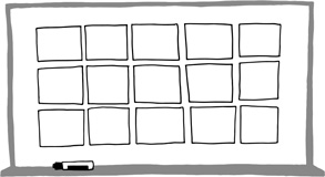 Для начала освободите маркерную доску и нарисуйте на ней сетку из 15 пустых клеток для будущих «кадров». Каждый из них должен быть размером примерно с два стандартных листа бумаги. Если вам трудно проводить длинные прямые линии (а это мало кто сумеет), вы можете обозначить границы клеток не маркером, а цветным скотчем.