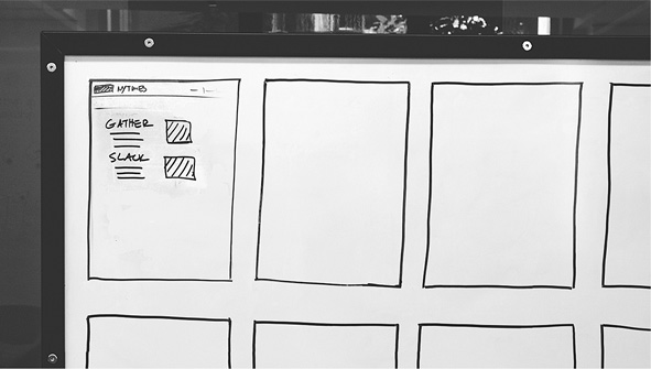 В свое время в прессе было много положительных отзывов об этом полезном изобретении. Многие клиенты впервые узнали о данном мессенджере, прочитав ту или иную статью. Поэтому Мёрси предложила начать с вымышленной статьи в The New York Times. Это могла быть статья о «новых тенденциях в программных продуктах для офиса» – что дало бы нам возможность естественным образом познакомить участников тестирования с двумя нашими продуктами (имеются в виду Slack и Gather). Вот что мы нарисовали на сториборде: