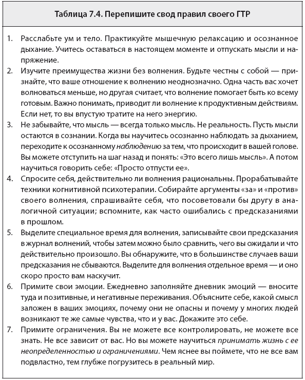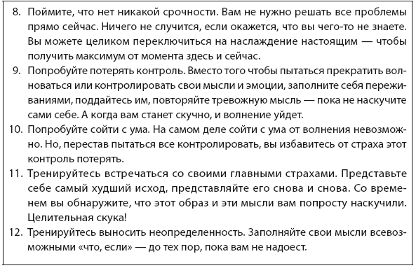 Мы рассмотрели целый ряд эффективных техник – если использовать их в сочетании друг с другом, последовательно, в течение продолжительного периода времени, ваше генерализованное тревожное расстройство отступит. Вам нужно сформировать новые привычки: расслабляться, принимать, думать, справляться с ощущением срочной необходимости, неопределенности, риска и с потребностью в контроле. Для этого понадобится какое-то время, и, скорее всего, вам придется пережить сильные приступы волнения. Но не беспокойтесь из-за этого – просто продолжайте использовать описанные здесь техники.