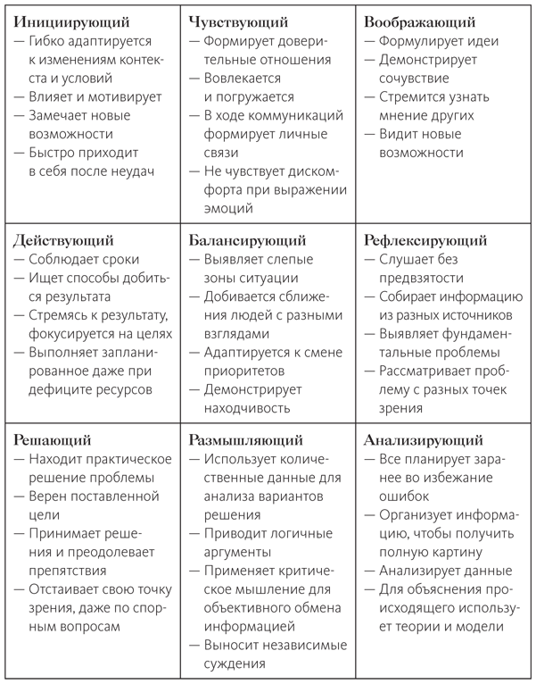 Гибкий подход к обучению, то есть способность в зависимости от ситуации использовать любой из девяти стилей, помогает добиваться успеха. Берясь за очередную проблему, лидер проявляет и решимость, и мудрость; врач устанавливает с пациентом эмоциональную связь и одновременно выполняет сложную процедуру; предприниматель создает продукт и находит способ его продать — эти люди умеют управлять тем или иным предпочитаемым стилем обучения, но освоили и запасные, возможно, противоположные привычному. Поведение станет менее шаблонным, если вы научитесь применять все девять подходов. При этом ни одно из их проявлений не может быть плохим или хорошим: со временем вы овладеете каждым методом. Поначалу можно окружить себя людьми, чей стиль дополняет ваш, чтобы они могли компенсировать отсутствующие пока у вас навыки. В долгосрочной перспективе стоит развить способности, соответствующие каждому варианту обучения.