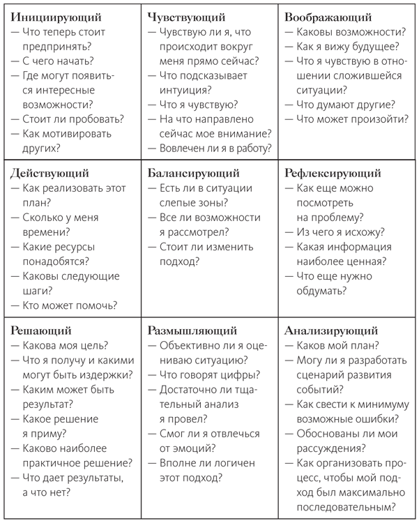 Поняв, какой именно подход требуется в той или иной ситуации, мы начинаем действовать гораздо более эффективно. Конечно, наилучших результатов мы достигнем, если освоим все возможности каждого стиля, но не менее важно и умение применять их в зависимости от обстоятельств. В одних ситуациях можно опираться на Чувствующий метод — и получить отличные результаты; в других нужен логический анализ. Как правило, принятие решений требует оценки вариантов и размышлений, чтобы определить оптимальный выход. Если нужно выбрать, в какой ресторан пойти, лучше опираться на Чувствующий, а вот покупка акций не обойдется без Анализирующего. Планирование в целом требует Рефлексирующего, Анализирующего и Размышляющего подходов, чтобы грамотно сформулировать перечень действий. Но в зависимости от обстоятельств применяются и другие: для разработки вечеринки нужен Чувствующий стиль, а для распределения бюджета — Анализирующий или Размышляющий.