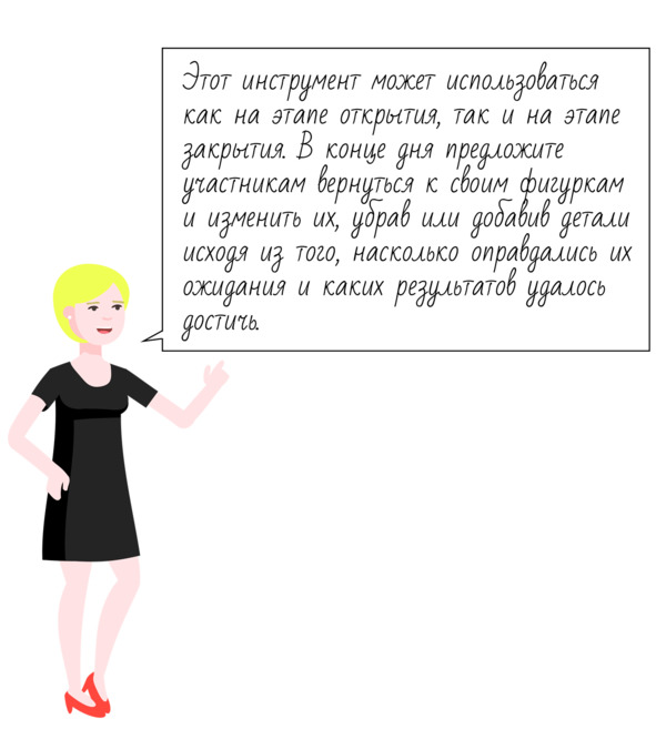 Каждый фасилитатор хотя бы раз использовал конструктор LEGO® в ходе своих сессий. Существует даже целая методика – Lego® Serious Play®, разработанная Йоханом Русом и Бартом Виктором. В ее основе пять простых шагов: представление вопроса, на который необходимо найти решение; строительство индивидуальных моделей, отвечающих на этот вопрос; представление индивидуальных моделей команде; создание общей модели и поиск связей; рефлексия. По технологии, у всех участников должен быть одинаковый набор деталей.