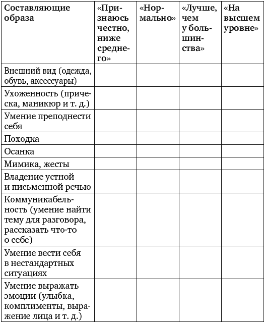 Ответьте на вопрос, насколько удачно у вас получается создавать образ. Все ли элементы персонального имиджа развиты одинаково хорошо? Заполните таблицу. Оцените каждый компонент, насколько хорошо, на ваш взгляд, он у вас развит. Поставьте галочку в соответствующей колонке.