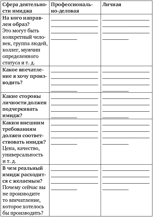 Заполните анкету. Дайте ответы на вопросы относительно сферы предназначения вашего имиджа. Я их сразу разделила на две группы: профессионально-деловая и личная.