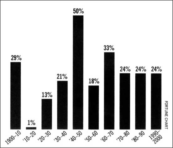 В этом веке были, конечно, и очень трудные годы – например, период Великой депрессии – с 1929 по 1933 год. Но если посмотреть на ВНП на душу населения по десятилетиям, что представлено в графике на первой странице, то мы увидим нечто невероятное: как нация, мы последовательно продвигались на протяжении всего века. Так что можно предположить, что экономическая ценность США – по крайней мере, измеренная рынком ценных бумаг – будет расти так же, соответственно, последовательными темпами.