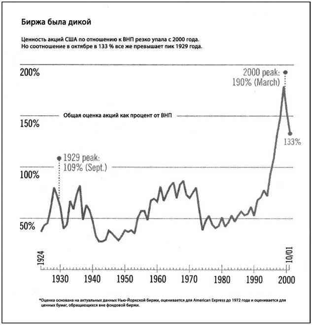 Но не слишком. График в статье, основываясь на системе подсчетов Баффетта, показывает, что цены все же были исторически высокими по сравнению с ВВП. График стал известным: в последующие годы я часто получала звонки и письма с просьбой к Fortune обновить данные. Мы в итоге так и сделали, опубликовав новую версию графика в начале 2009 года, и тогда казалось, что акции больше не будут опускаться.