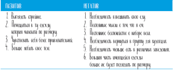 Прежде всего Ребекка исследовала свой язык. Фраза «не более 120» делала ее «я должна» абсолютным. Ребекка переписала свое правило более гибко: «Я бы хотела иметь вес около 120 фунтов». Далее она исследовала возможные последствия применения своего «я должна». Вот список позитивных и негативных результатов: