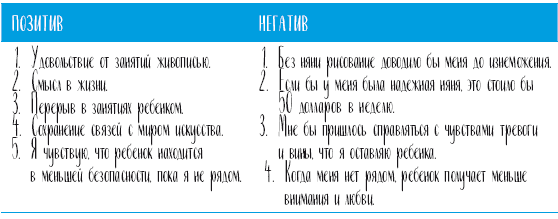Вот как она справилась со своими «я должна». Сначала она переписала их, используя более гибкие формулировки: «Я хочу отдавать большую часть времени своему сыну, но при этом продолжать писать картины настолько активно, насколько это возможно». Затем она исследовала последствия каждого «должна»: