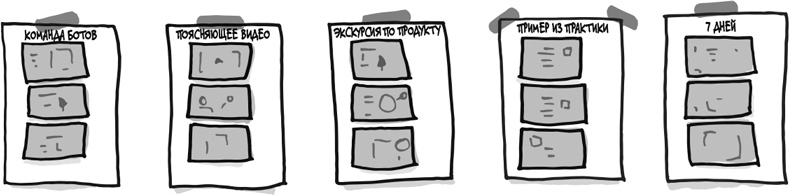 Используйте для этого скотч. Разместите наброски на стене, как это делают с картинами в музеях: по одному, чтобы получился длинный ряд. Это позволит участникам равномерно распределиться вдоль стены и не спеша, избегая толчеи, рассмотреть каждый набросок. На всех эскизах «кадры» должны по возможности располагаться в хронологическом порядке, сохраняя последовательность событий, отраженную в пользовательской истории: