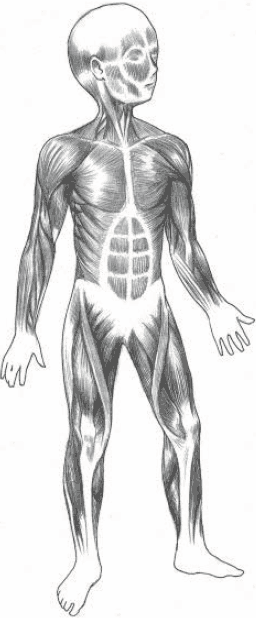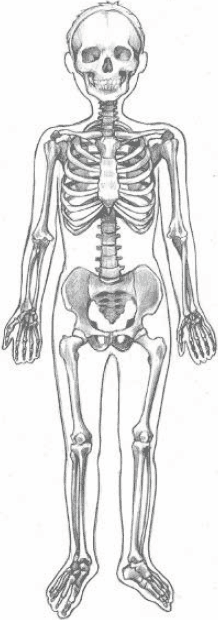 Дети садятся в общий круг и трогают, ощупывают разные части своего тела, обращая внимание на то, что некоторые места на теле мягкие, а некоторые – твердые. Тренер интересуется тем, что знают дети о строении своего тела: знакомы ли они с понятиями «мышечная система», «скелет» и т. д. Затем тренер знакомит группу с изображением костно-мышечной системы человека (рис. 2; 3) и объясняет, что мягкие места на теле – это мышцы, а твердые – это кости и суставы.