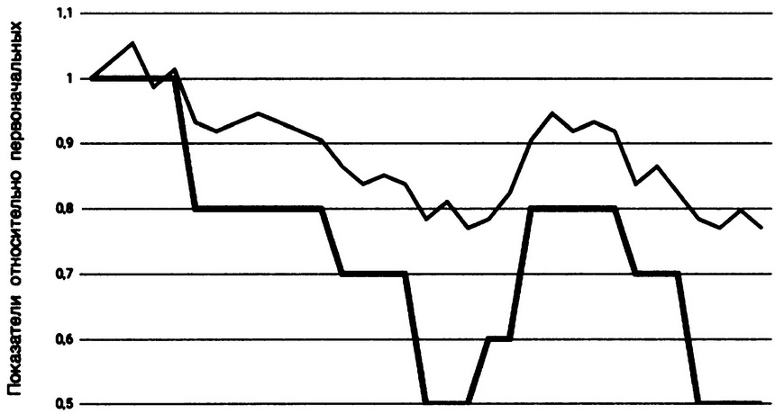 Рис. 7.2. Динамика общей алекситиминности клиентки Ц. на фоне динамики алекситиминности управляющей группы представлений. Жирная черная линия — управляющий параметр, тонкая серая — общий показатель алекситимии. Каждый показатель нормирован на свое значение в начале анализа