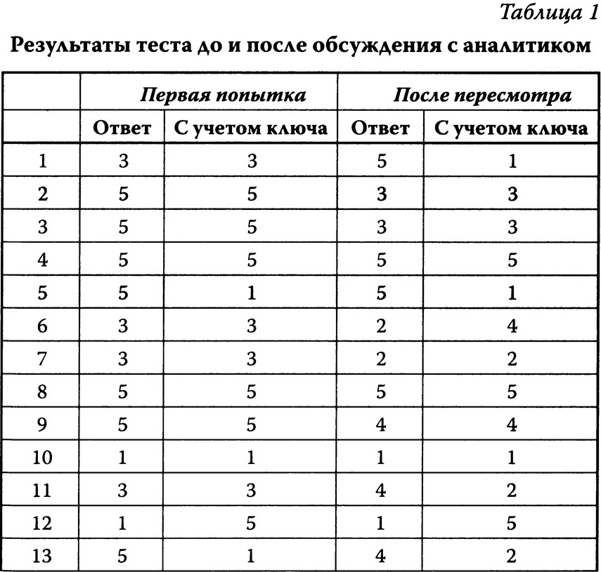 В первом приближении решено было так: ставить 5 для обведенного номера, 1 — для зачеркнутого, 3 — для пустого. После восстановления порядка вопросов и применения ключа был получен (в целом) ожидаемый результат (см. первые два столбца таблицы в конце параграфа). Зацепкой стали явные противоречия в вопросах о мечтах (выделены в таблице 1 на странице 251-252 серым фоном). С одной стороны, клиентка казалась мечтательной натурой, но осуждала себя за это качество. Что и стало предметом беседы.