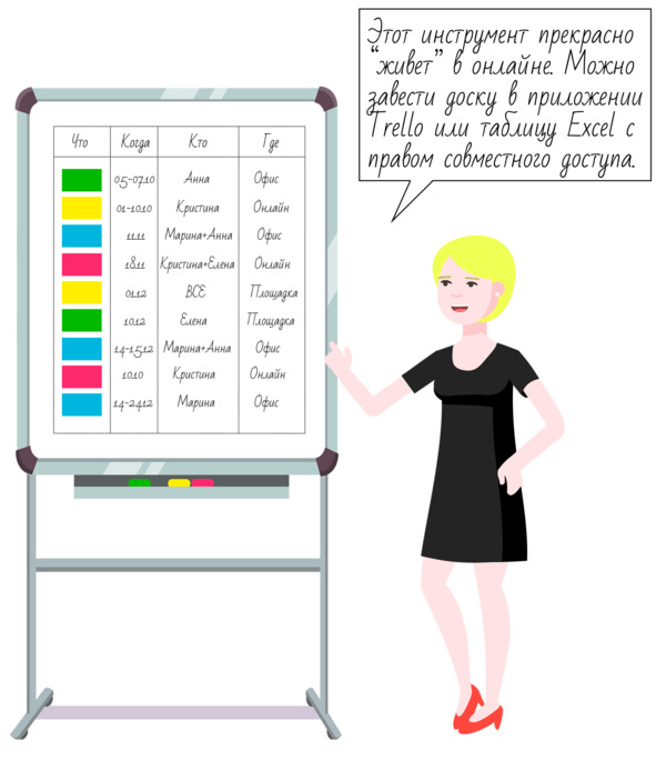 Простой, практичный, подробный и при этом наглядный инструмент планирования действий. При помощи графы «ГДЕ» команда может получить картину по намеченным действиям.