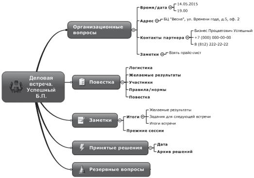 Ментальные карты можно использовать не только для организации бизнес-процессов, но и для планирования личного времени. В частности, формирования расписания и структуры деловых встреч. Ментальные карты помогут вам провести структурированную, организованную, заранее продуманную встречу и извлечь из нее максимальный результат. Для данных целей ментальную карту следует формировать следующим образом.