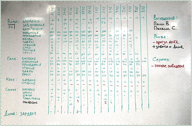 На одном из наших тренингов слушатель Виктор Бельченко (Управление по работе с проблемными активами СБ РФ) познакомил нас с графиком контроля регулярных задач, который он внедрил у себя дома. У него заведена магнитная доска, на которую выписаны регулярные задачи всех членов семьи. Это мама, папа и три сына, младшему из которых на тот момент было 2 года, но он попросил, чтобы его тоже включили. Помимо спортивных упражнений на доску вынесены и бытовые задачи: почистить обувь, помыть посуду, пропылесосить. Отдельное поле справа предназначено для подведения общих, не относящихся к регулярным задачам, итогов за неделю. Так, например, минусом ребенка за неделю отмечен прогул английского, однако плюсом является забота о младшем брате. Еще одно поле справа – задачи на выходные.