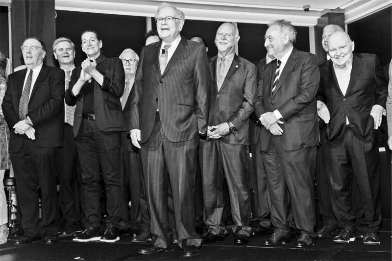 Джеймс Паттерсон (автор бестселлеров, один из самых высокооплачиваемых и продаваемых писателей в мире по версии журнала Forbes), Стив Кейс (America Online), Мартин Ротблатт, Уоррен Баффетт, Крейг Вентер (один из лидеров в расшифровке генома человека), Рэй Далио (миллиардер, основатель инвестиционной компании Bridgewater Associates), Сэнди Вейл и Джек Уэлч на торжественном вечере, посвященном 100-летию Forbes. 19 сентября 2017 г.