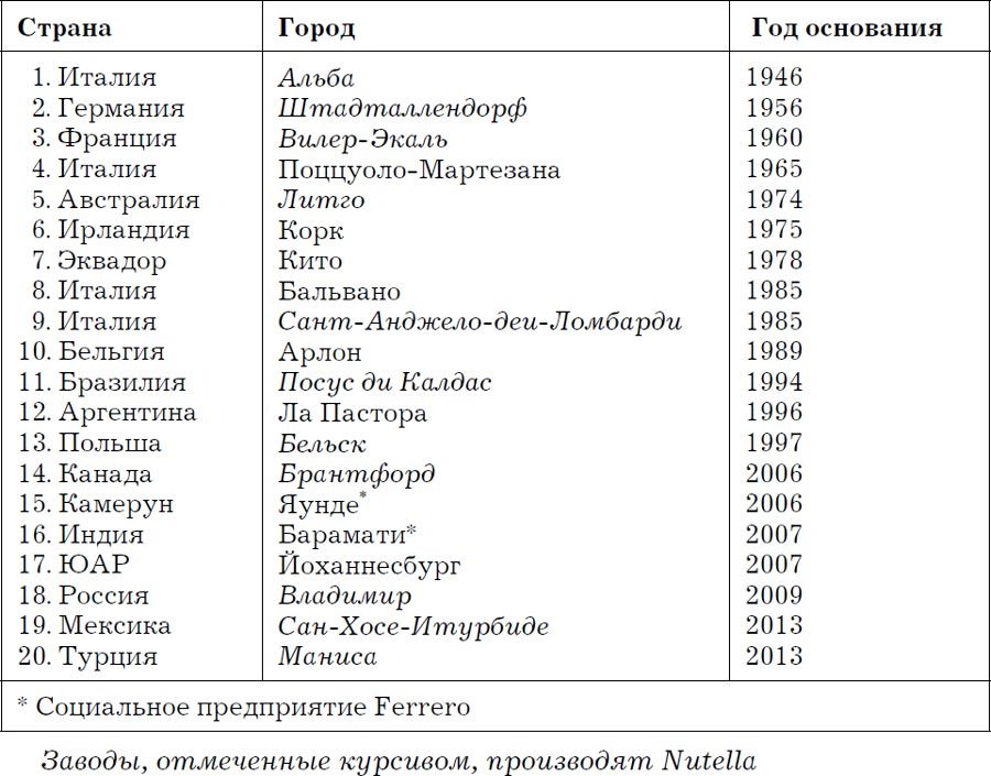 Очень важно определить место. Почти все заводы Ferrero находятся в небольших городах вроде Альбы, родного города: специалисты при решении о размещении производств избегают больших, загрязненных городов или мест с химической или металлообрабатывающей промышленностью, наличие которых может сказаться на качестве продукции Ferrero. В компании люди говорят: «Каждый новый завод — как кондитерская». Более того, он должен быть расположен в месте, где легко можно добыть сырье. В Турции завод был построен за 2 года рядом с Манисой, где выращивают коров, так как молоко — один из главных ингредиентов в Nutella и батончиках Kinder Pingui, которые являются частью линейки охлажденных продуктов Ferrero. В Канаде — производство расположили в Онтарио, недалеко от Брантфорта, где выращивают фундук. Важна даже вода: она должна быть доступна и не загрязнена тяжелыми металлами.
