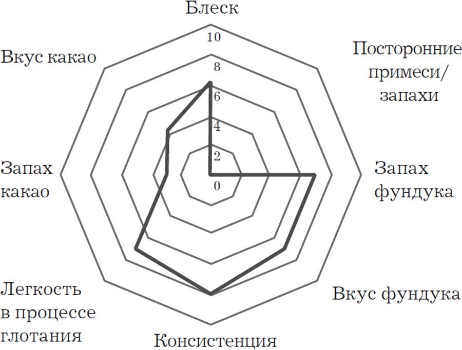 Этот тест, созданный группой экспертов, предлагает глубокий и содержащий важные параметры анализ, который может заменить оценки типа «отлично», «хорошо» и «удовлетворительно». На диаграмме результат теста проиллюстрирован контуром паутины, которую образуют точки, показывающие среднюю оценку параметров. Ferrero проводит около 510 анализов в год, и в каждом из них принимает участие около 10 дегустаторов на каждом заводе. Каждый год группа компаний проводит более 400 дегустаций и 33 900 тестов ежемесячно и специальную дегустацию с помощью отдельной экспертной группы.