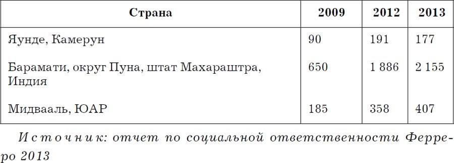 Это всего лишь три из многочисленных историй, опубликованных в фотоальбоме «Социальные предприятия Ferrero» под редакцией Катерины Гинсбург. По данным за 2013 год, более 2700 людей работают на заводах в Яунде в Камеруне, Барамати в Индии (там расположено самое большое производство) и Мидвааль в ЮАР. Эти производственные объекты работают в соответствии с «социальным духом» не только потому, что они предназначены для создания рабочих мест в самых неблагополучных районах развивающихся стран, но и потому, что связаны с гуманитарными инициативами, объединенными под названием «Все дети мира» и направленными на улучшение здравоохранения и образования детей.