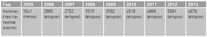 О потенциале эволюционных инноваций Samsung можно судить по количеству патентов, зарегистрированных в патентном ведомстве США (см. таблицу 7.1). Компания считает свою интеллектуальную собственность наиболее ценным корпоративным активом, поэтому с 1980-х годов настойчиво подает заявки на патенты в соответствующие ведомства и в Корее, и за рубежом. Учитывая, что патентные споры возникают все чаще и все сильнее могут влиять на компанию (например, затянувшееся патентное противостояние с Apple), Samsung больше внимания стала уделять управлению патентным портфелем[159]. В 2006 году компания уступила только IBM, зарегистрировав 2665 патентов в Бюро по регистрации патентов и торговых марок США[160], и с тех пор стабильно удерживает второе место. Как показано в таблице 7.1, в 2013 году Samsung получила уже 4676 патентов в США, почти утроив их количество по сравнению с 2005 годом.