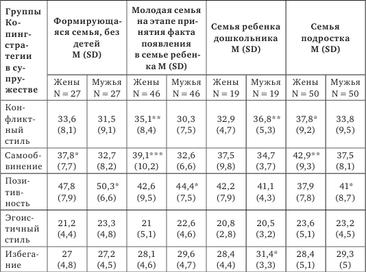 Мужья на этапах формирующейся семьи, появления нового члена семьи и семьи с подростком с супружескими трудностями совладают, используя позитивную стратегию, в отличие от супругов-родителей дошкольников. У последних предпочитаемыми стратегиями выступают конфликтный стиль и избегание.