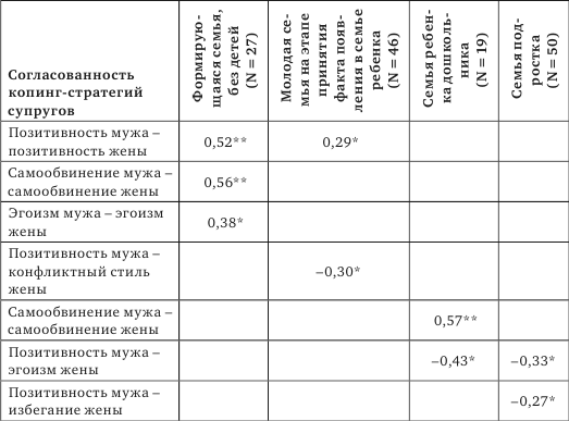 При анализе полученных корреляционных связей мы обнаружили, что выбор позитивного стиля, самообвинения и эгоизма в совладании с трудностями супругов формирующейся семьи соотносится друг с другом. По существу, в первые годы совместной жизни происходит взаимное приспособление супругов, поиск стиля поведения и построение модели отношений, которые удовлетворяли бы обоих. Усиление эмоциональной связи или эмоционального «настроя» в супружеской паре – основная задача, решаемая супругами на этом этапе. Мы видим, что в формирующейся семье выбор женой и мужем стратегий совладания совпадает, что отражает особую семейную организацию слияния и единства. Особенности этой организации хорошо описал К. Витакер (1988): двое отказываются от своего лица и становятся никем ради того, чтобы стать частицами симбиотического союза под названием брак.