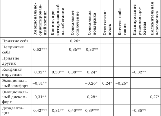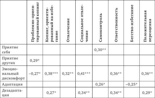 На следующем этапе исследования мы провели корреляционный анализ (табл. 4, 5). Нас интересовал вопрос, как уровень социально-психологической адаптированности отражается на выборе способов совладания в семье. Выделенные нами связи позволяют выявить следующие обстоятельства.