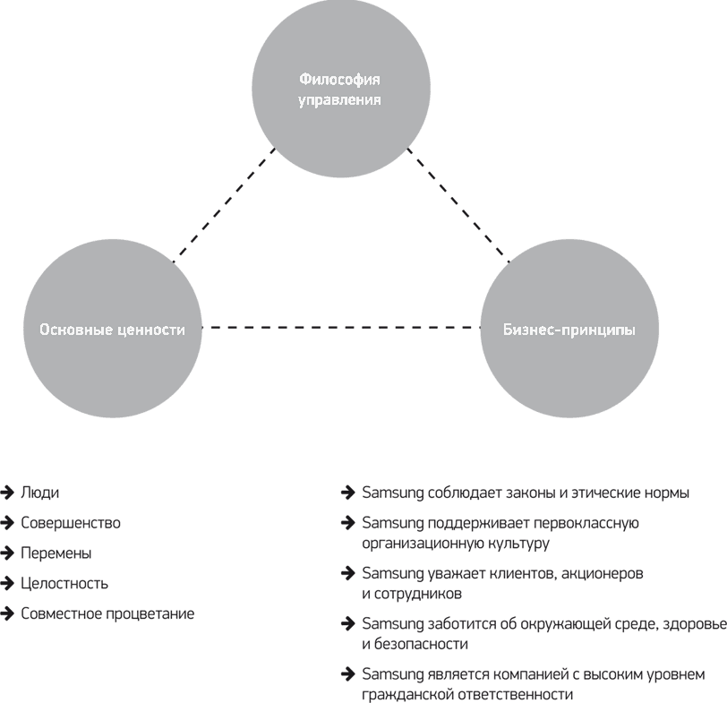 Еще раз основные ценности Samsung были изменены в 2005 году; это потребовалось, чтобы справиться с растущими проблемами внутри и вне группы. Внешние факторы побуждали Samsung формировать культуру, при помощи которой компания могла бы противостоять усиливавшейся глобальной конкуренции. Кроме того, статус мирового лидера обязывал Samsung быть социально ответственной компанией, обеспечивать этическое управление и придерживаться политики экологичности. Именно этого от Samsung ожидало международное сообщество. Проблем хватало и внутри группы. Приток новых сотрудников на ее корейские и зарубежные предприятия требовал поддержания сплоченности всего трудового коллектива. При этом компания остро нуждалась в опытных специалистах с внешних рынков и одновременно занималась повышением уровня собственной управленческой независимости. Для решения этих задач Samsung ввела систему «Триединство ценностей Samsung». Она должна была гармонизировать и воплощать философию управления, основные ценности и управленческие принципы (см. рисунок 4.8).